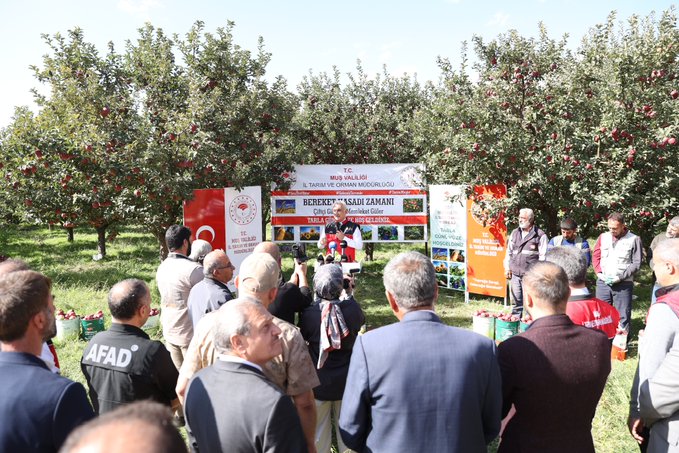 Muş İl Tarım ve Orman Müdürü Necattin Gönç ise, “Toplamda 357 bin hektarlık tarıma elverişli bir alan bulunmakta. Yürütülen tarımsal faaliyetlerden biri de meyvecilik faaliyeti. Meyvecilik anlamında ürün desenlerimizi, üzüm, elma, armut, ceviz ve az da olsa kirazdan oluşmakta. Elma ve armut da ilimizde önemli bir yer tutuyor. 4 bin 500 dönümlük bir alanda elma hasadı yapılıyor. İlimizde meyvecilik faaliyetinin geliştirilmesi, yaygınlaştırılmasına yönelik çalışmalarımızı yürütüyoruz. Yaklaşık 2 bin ton elma hasat etmeyi planlıyoruz. Bu yıl elma hasadından yaklaşık 100 milyon gelir beklemekteyiz” diye konuştu.