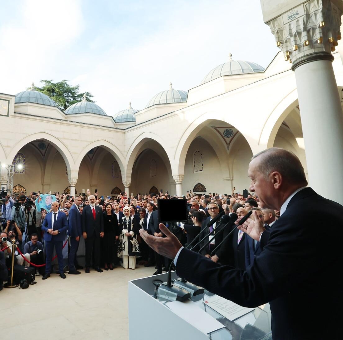 Cumhurbaşkanı Recep Tayyip Erdoğan, Arnavutluk’un başkenti Tiran’da Türkiye’nin desteğiyle Balkanlar’ın en büyük camisi olarak inşa edilen Namazgâh Camisi’nin açılışında yaptığı konuşmada “Bu kutsal mekândan bir kez daha vicdan sahibi tüm dünyaya, İsrail saldırganlığına karşı ortak tavır almaları çağrısında bulunuyorum” dedi.