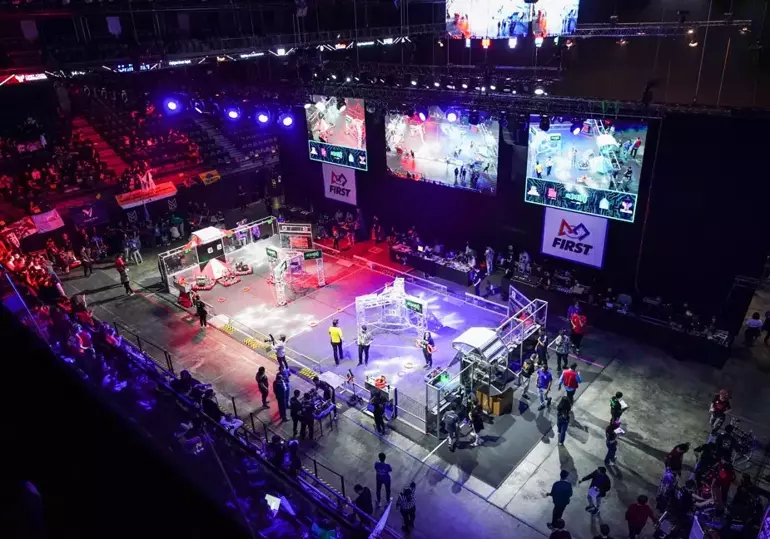 FIRST Robotics Competition liselerarası robot yarışmasında, öğrenciler tasarladıkları robotları büyük bir özveri ile kullanarak, belirlenen görevleri zamanla yarışarak başarıyla tamamladılar.