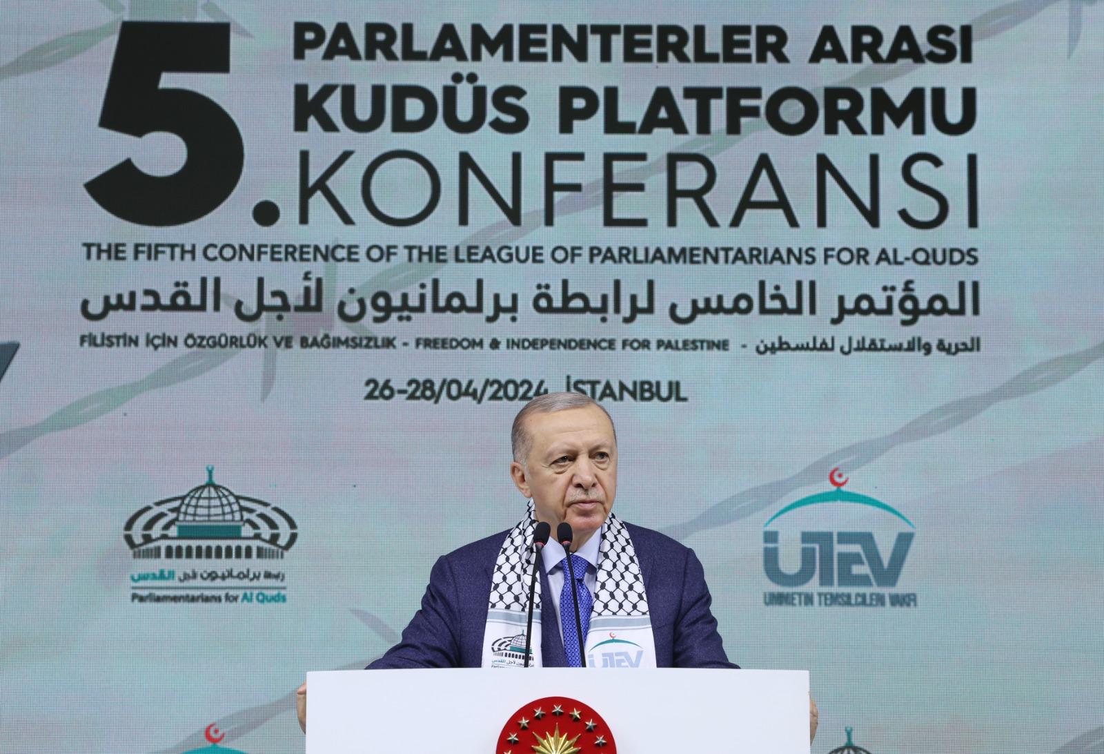 Parlamenterler Arası Kudüs Platformu 5. Konferansı’nda yaptığı konuşan Cumhurbaşkanı Recep Tayyip Erdoğan, katılımcıları selamlarken kalbi Kudüs ve Filistin için atan parlamenterleri ülkede ağırlamaktan büyük memnuniyet duyduğunu söyledi.