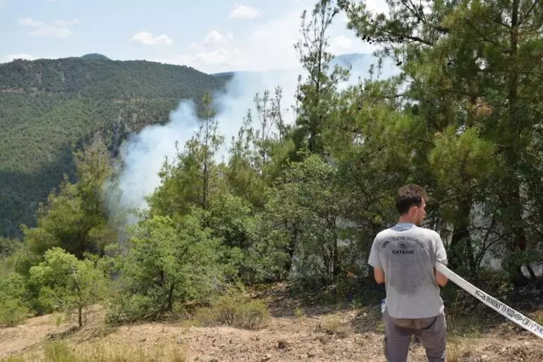 Eskişehir'in Sarıcakaya ilçesindeki ağaçlandırma sahasında başlayan yangın, Orman Bölge Müdürlüğü ekipleri tarafından kontrol altına alınmaya çalışılıyor.