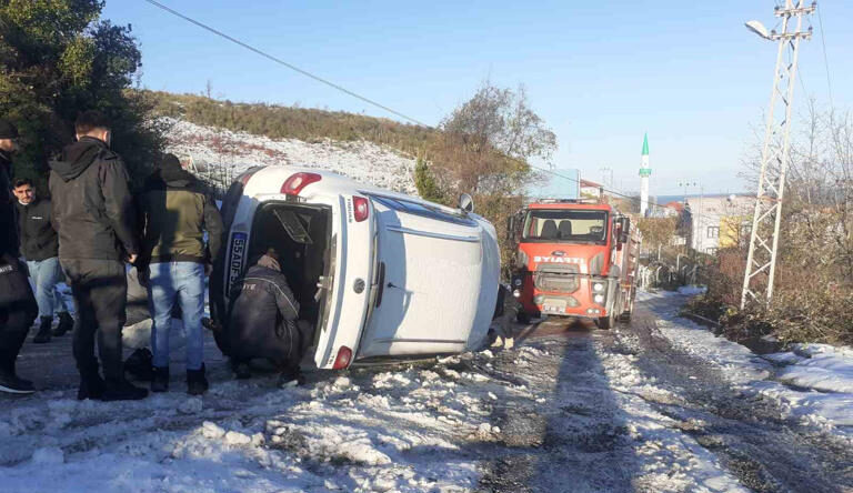 Sinop Türkeli’de, buzlanma nedeniyle otomobil yan yattı!