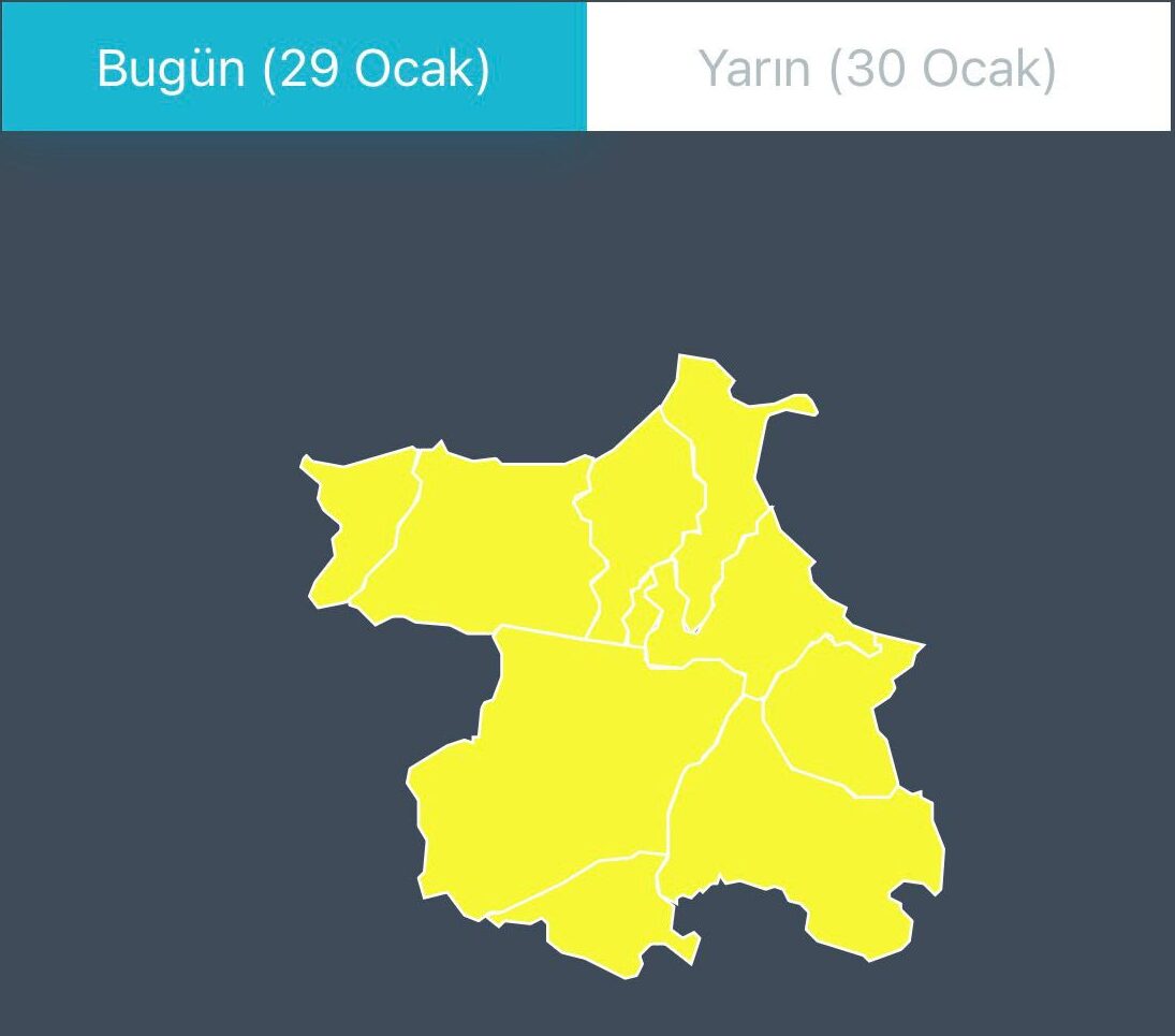 Merkez ve Tüm ilçelerimiz sarı kodlu meteorojik uyarılıdır. Güney yönlerden kuvvetli rüzgar ve fırtına (40-60km/saat, yer yer 60-80 km/saat) beklendiğinden; Ulaşımda aksamlar, çatı uçması, ağaç devrilmesi, soba ve doğalgaz kaynaklı zehirlenmeler gibi olumsuzluklara karşı dikkatli ve duyarlı olunması gerekmektedir.