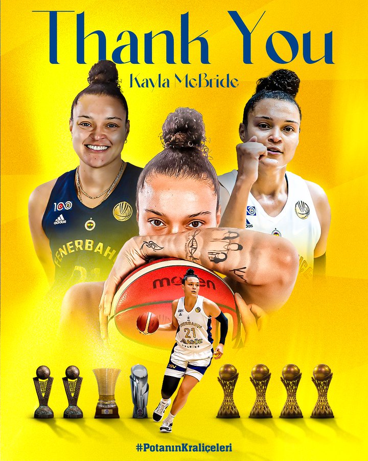 “2020 yılında giymeye başladığı çubuklu formamızla sayısız zaferimizde ve tarihi başarılarımızda büyük pay sahibi olan Kayla McBride, ailevi sebeplerden ötürü 2024-25 sezonunda ülkesinde kalmak istediğini yönetimimiz ve idari ekibimizle paylaşmıştır. 21 numaralı formamızı giydiği dört sezonda sarı lacivert renklere olan aidiyetiyle ön plana çıkan Kayla, her zaman ailemizin bir parçası olacaktır. Yollarımızın bir gün tekrar kesişeceğine inandığımız Kayla McBride’a tüm emekleri için teşekkür ediyoruz.” ifadeleri kullanıldı.