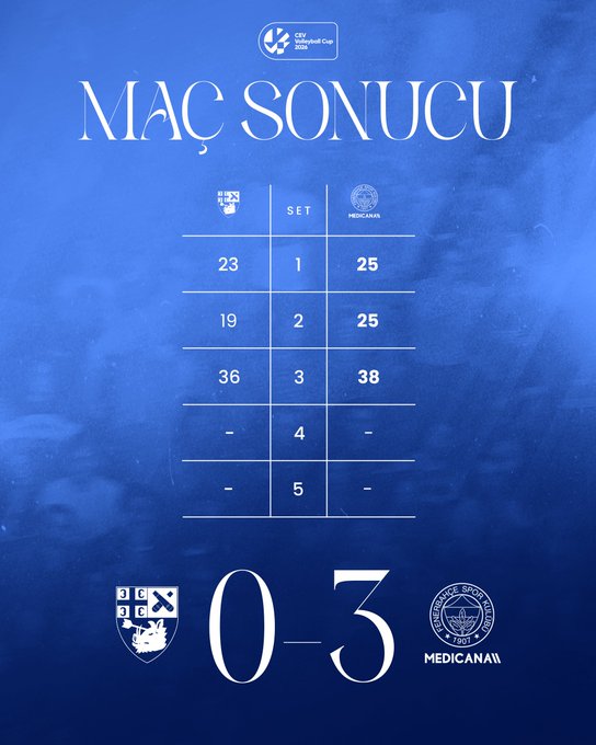 Sportova Jezero Kragujevac’ta oynanan karşılaşmanın setleri 23-25, 19-25, 36-38’lik skorlarla temsilcimiz Fenerbahçe Medicana lehine 3-0 tamamlandı.