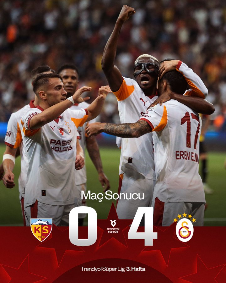 Galatasaray, Trendyol Süper Lig'in 3. haftasında konuk olduğu Kayserispor'u deplasmanda 4-0 yenerek haftayı 3 puanla kapattı.