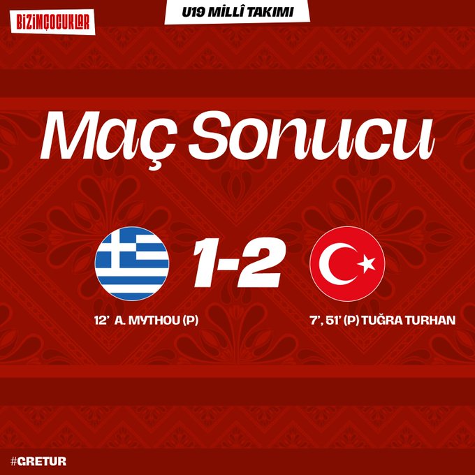 Antalya Arslan Zeki Demirci Spor Kompleksi’nde oynanan karşılaşmada U19 takımımızaibiyeti getiren golleri 7. ve 51. (P) dakikalarda Tugra Turhan kaydetti. Yunanistan U19 takımının golünü ise 12. dakikada penaltıdan Anestis Mythou kaydetti.